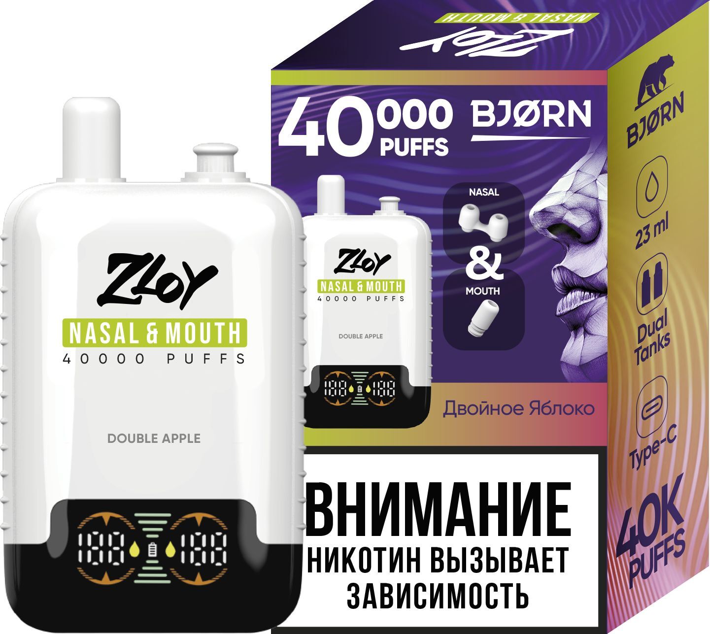 Купить одноразовые электронные сигареты BJORN Zloy Nasal&Mouth Double apple - двойное яблоко 40000 в Москве и России